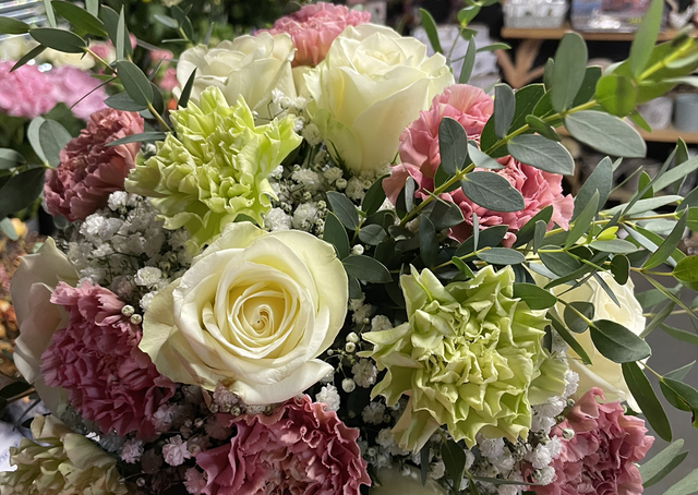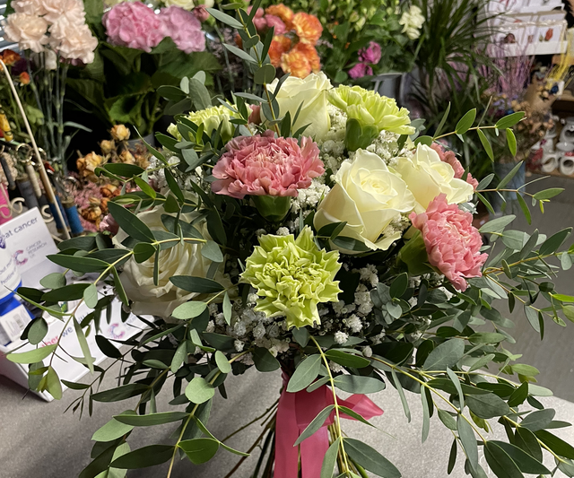 Brides bouquet with roses and carnations This can be made in different colours. This order needs twin weeks minimum to be completed