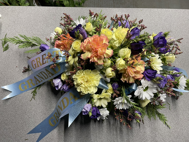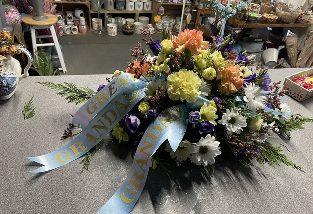 Oasis funeral spray can be ordered in your colours of choice , words can be added. Will need a weeks notice to complete the order. This can be made for collection or local delivery is available.