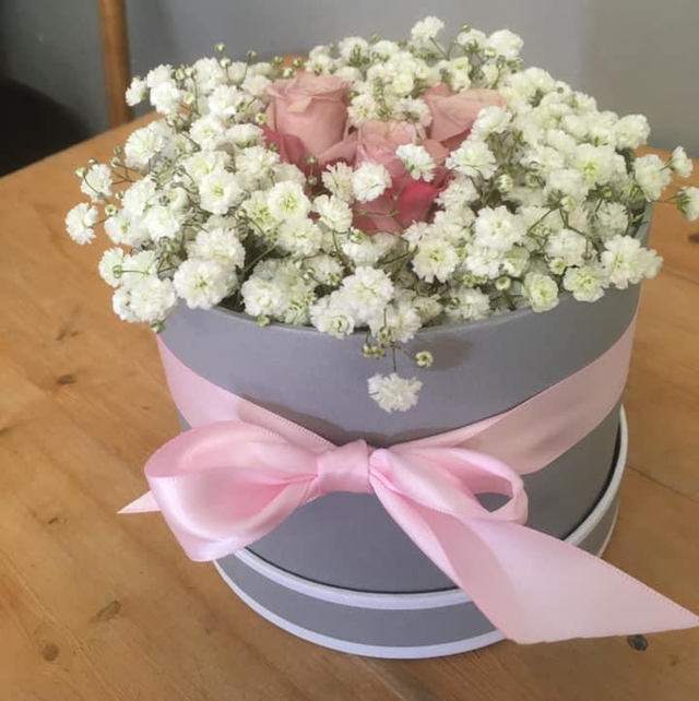 Small hat box with roses and gyp Colours of choice when ordering. Need a week notice so it can be completed for the date needed