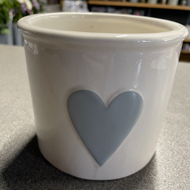White plant pot with a grey heart on both sides
